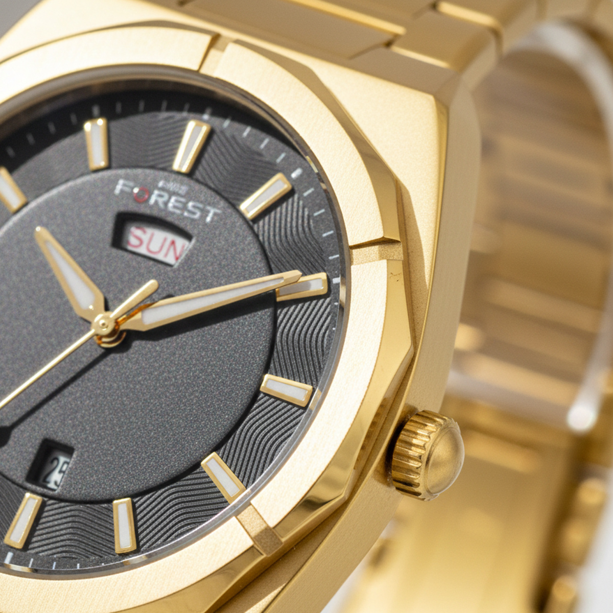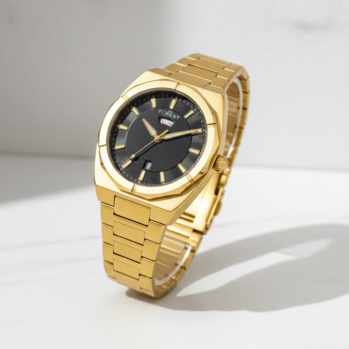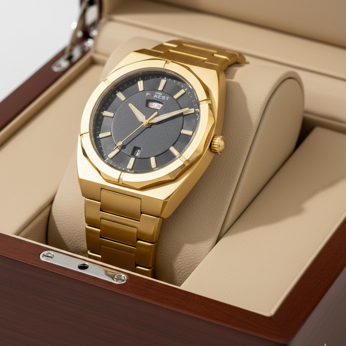 Forest Mens Luxury Analog Watch Gold, Exude confidence and command attention with the Forest Luxury Men’s Analog Watch. Designed for the man who values both rugged durability and refined aesthetics, this timepiece features a bold, industrial-inspired octagonal bezel that mirrors the silhouettes of high-end luxury horology.