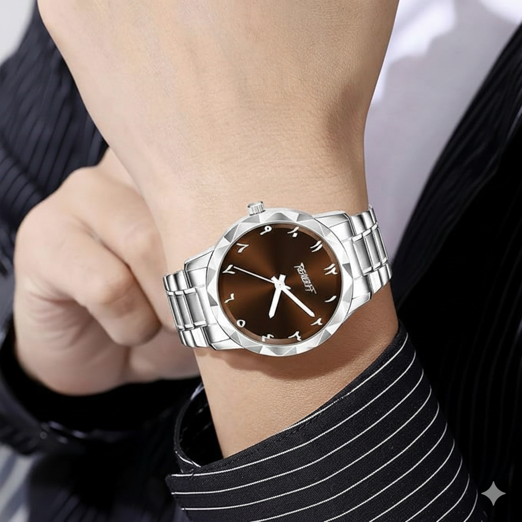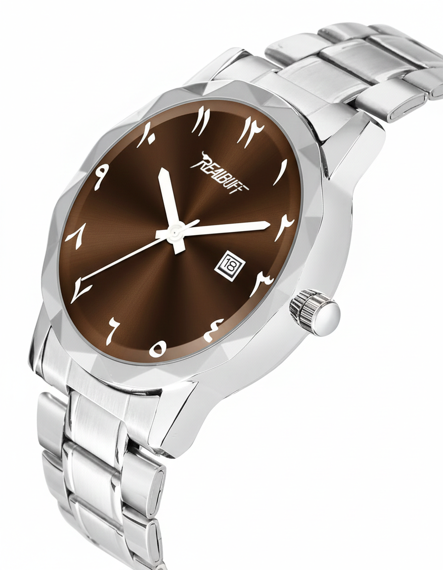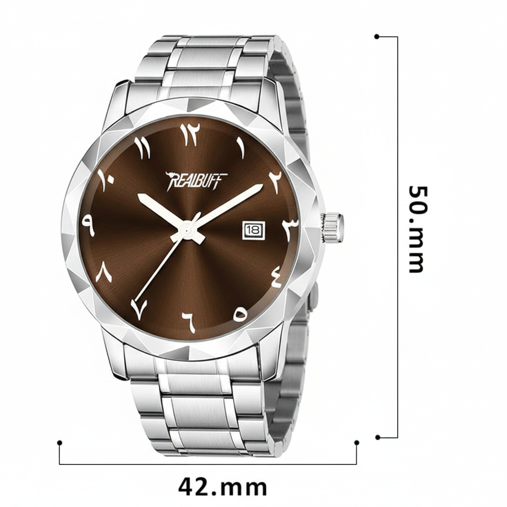 RealBuff Arabic Analog Watch – For Men Steel Aura Time and Date, Experience the perfect fusion of heritage and high-fashion with the RealBuff Eastern Series. This timepiece isn’t just about keeping time; it’s about making a statement. Designed for those who appreciate cultural depth paired with modern sophistication, the RealBuff watch features a striking aesthetic that commands attention from every angle. The signature geometric faceted bezel creates a diamond-like shimmer, perfectly framing the sunray dial and its elegant Eastern Arabic numerals. Whether you’re heading to a boardroom or a formal gala, RealBuff ensures you arrive with distinction.